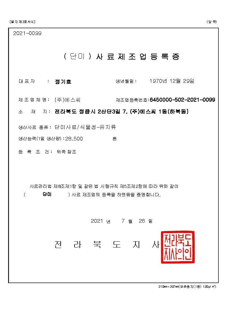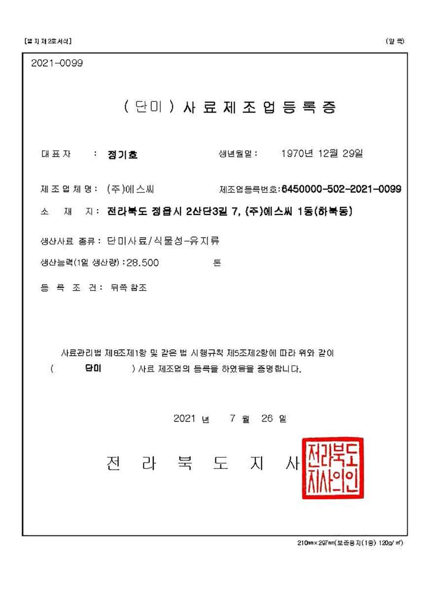 Registration Certificate for Compound Feed Manufacturing (Refined Oils)