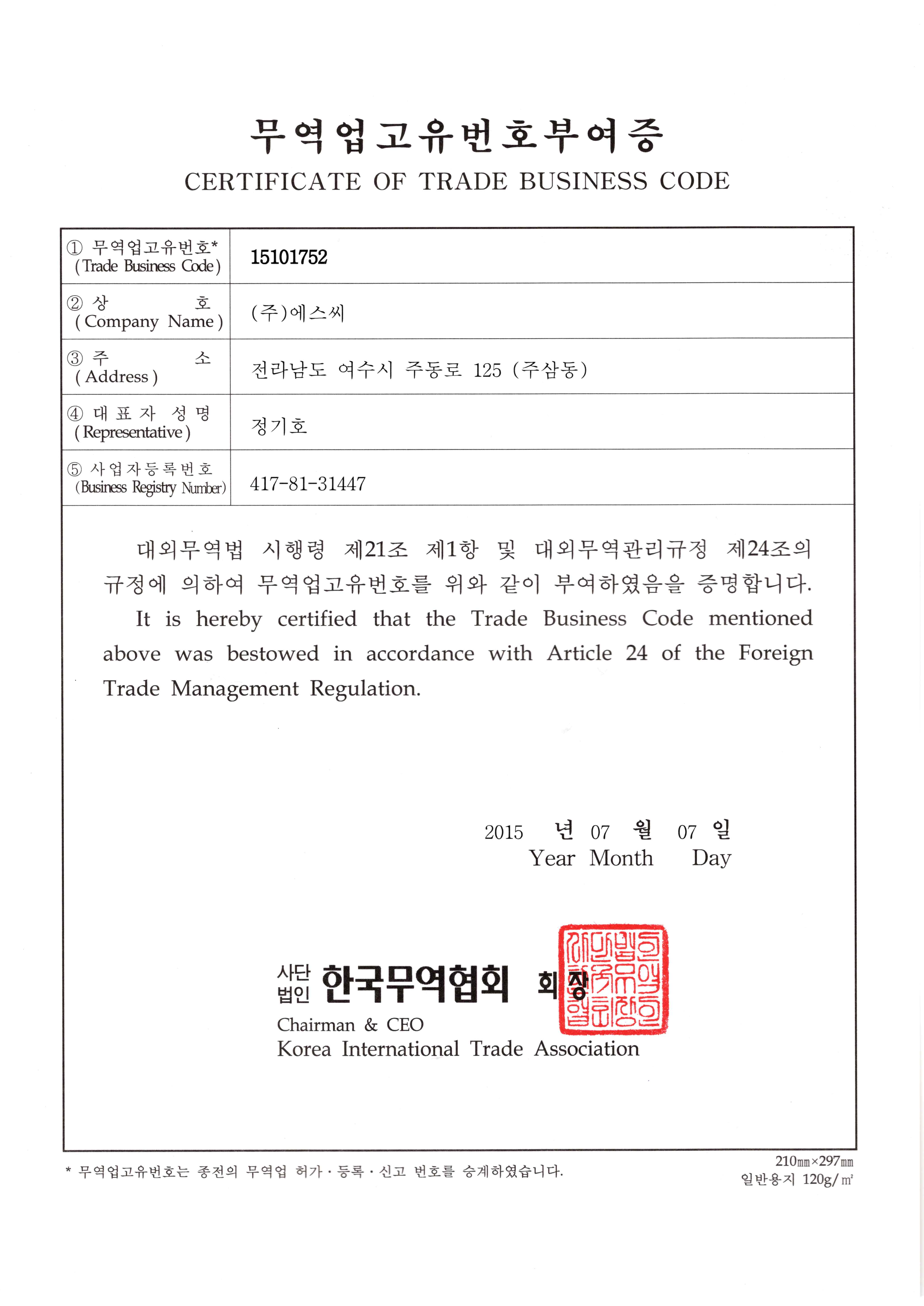 Certificate of Trade Business Code