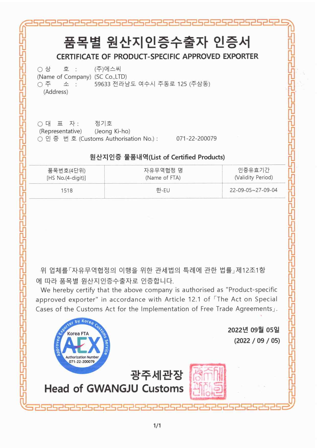 Certificate of Product-Specific Approved Exporter